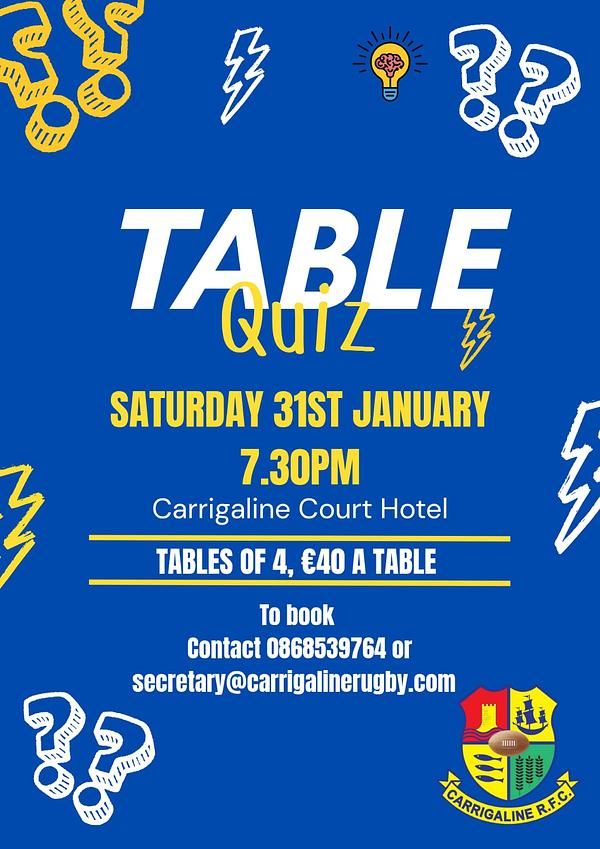 Carrigaline Rugby Club is delighted to announce that we are holding a Quiz Night on Saturday January 31st.